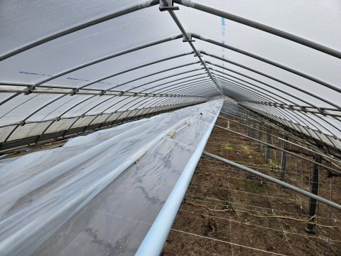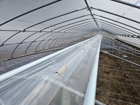 内張り 外のビニール張りが終わったのでハウスの中の内張りビニール張りをしています。 ハウスの内側に開閉式のビニールを張ることで保温性を高めます。 ハウスのなかの高い場所での作業なのでちょっとでも日が差すと汗だくですが、今日は曇りだったので快適に作業できました。 綺麗に均一にビニールを開閉するようにビニールを張るのはかなり技術を必要とするのですが無事に綺麗に張ることができました。 2026-02-24 | 春友ぶどう園日記 | お庭のお手入れ >